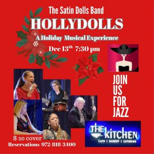 Join us The Satin Dolls Band as we celebrate the holiday season! Rebecca Cordes (p) Peggy Honea (b) , Special Guest Ashley Westgate (d), Joyce Spencer (s/f) Carolyn Lee Jones (v). $20 cover charge terrific full bar, lovely menu and by attending you will be helping us keep the Kitchen Cafe going as Tony Hakim recovers from cancer! He is feeling better every day!